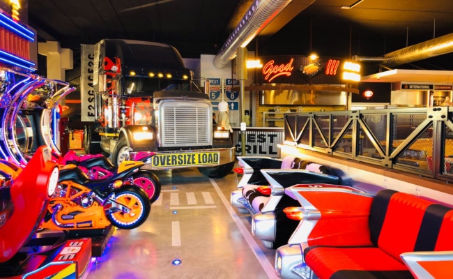 En este proyecto decorativo de temática americana, el departamento de diseño ha creado auténticas obras de arte. Incluso los sofás de espera para las máquinas recreativas, se inspiran en los cadillac de los años 50. Una zona separada, diferencia la propuesta gastronómica, siendo chesters y lámparas de diseño los que te invitan a cambiar el modo americano por el modo cool.